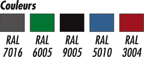 Acier peint, RAL 6005 (autres RAL standards, voir nuancier).