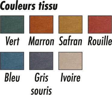 Assise, dossier et accoudoirs en mousse polyuréthane 23 ou 30 kg/m3, ép. 30 ou 80 mm, recouverts de ouate polyester 150 g/m2 avec revêtement tissu 100 % polyester 340 g/m2.